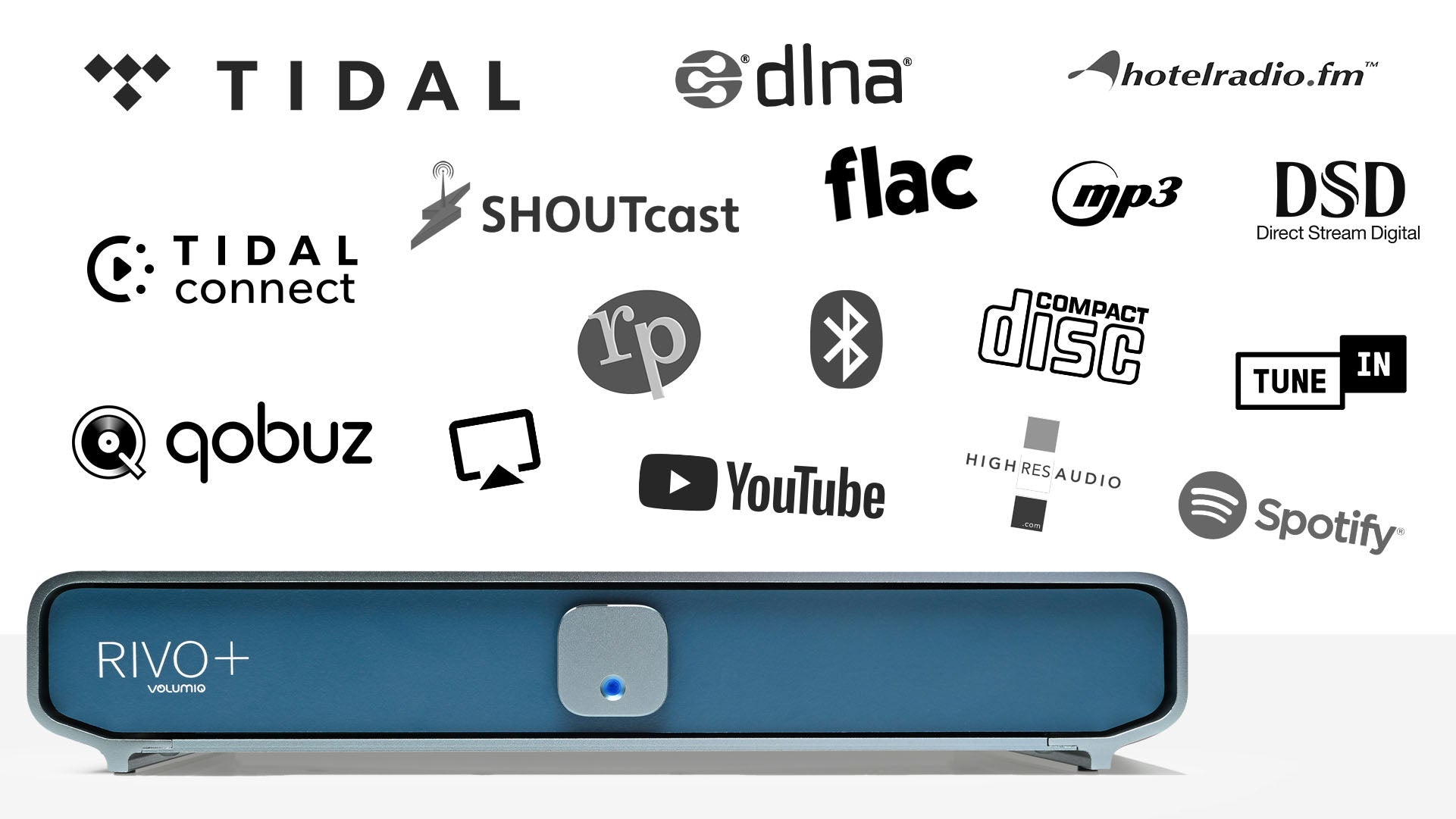 Rivo+を使用して、Spotify、TIDAL、Qobuzなど、お好きな音楽サービスからストリーミングを利用することができます。また、Volumioのプラグインを使用して、さらに様々なサービスや機能に接続することができます。YouTube、Soundcloud、Mixcloud、Radio Paradise、FusionDSPなどです。